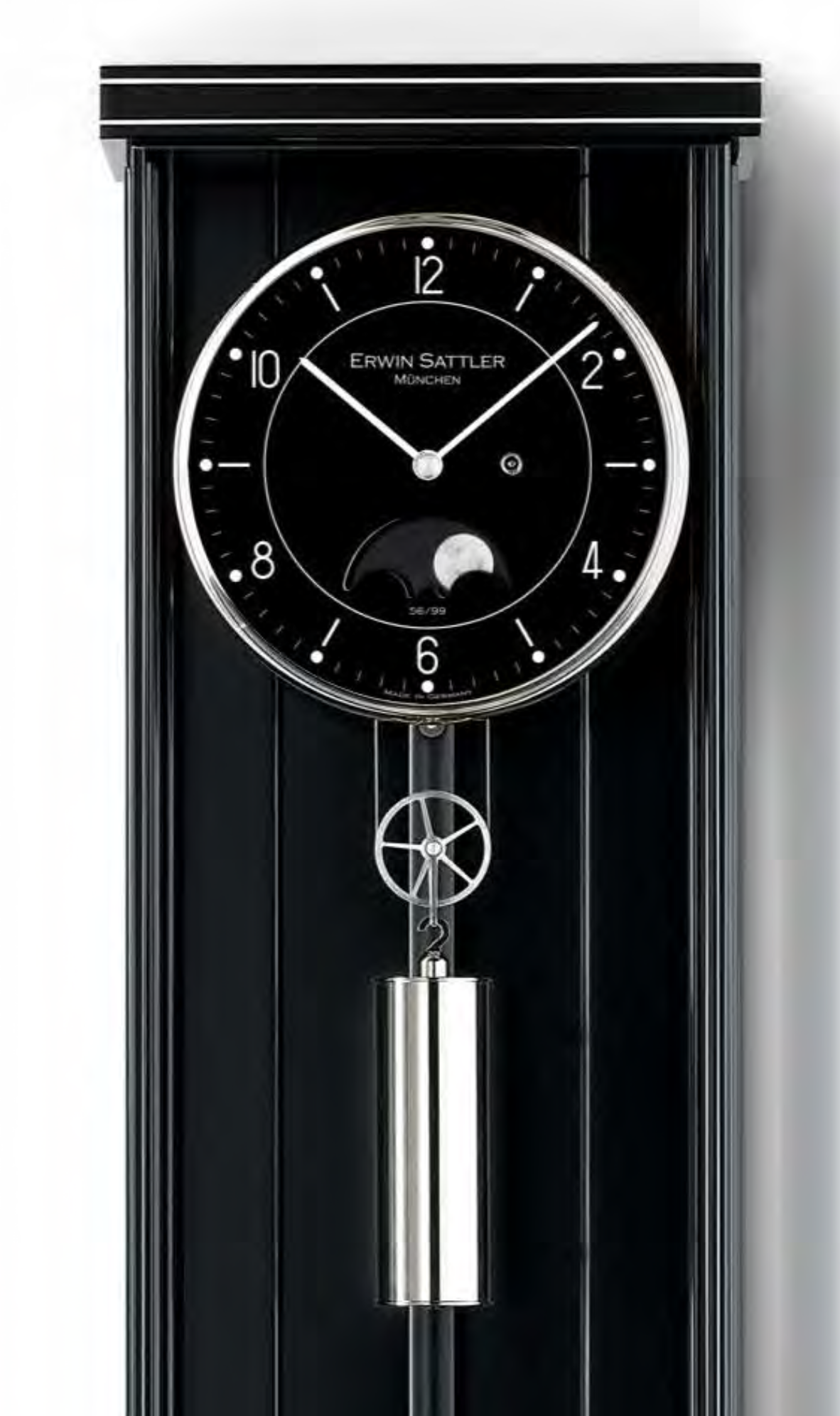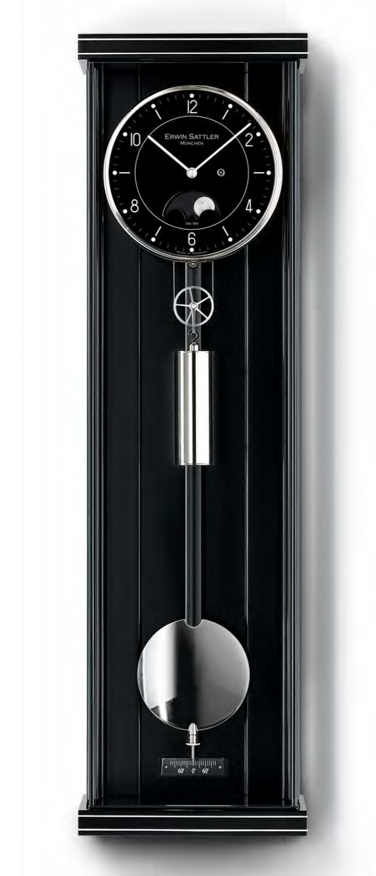Bei diesem Erwin Sattler Modell verdient das zweiteilige, schwarz eloxierte Zifferblatt besondere Beachtung. Das schöne Antlitz der Wanduhr Opus PM 70 II ist aus Aluminium gefertigt, seine Oberfläche wird elektrisch oxidiert. Neben den arabischen Stundenziffern glänzen 12 kleine polierte Indexe. Durch die halbkreisförmige Öffnung oberhalb der Ziffer „6“ lassen sich die Phasen des Mondes auf einer handbemalten Scheibe ablesen. Diese unterstreicht noch einmal den hohen Anspruch, welcher diesem Zeitmesser zugrunde liegt. Von Neumond zu Neumond vergehen genau 29,5 Tage. Somit wird nach drei Jahren eine kleine Korrektur dieser Indikation fällig.