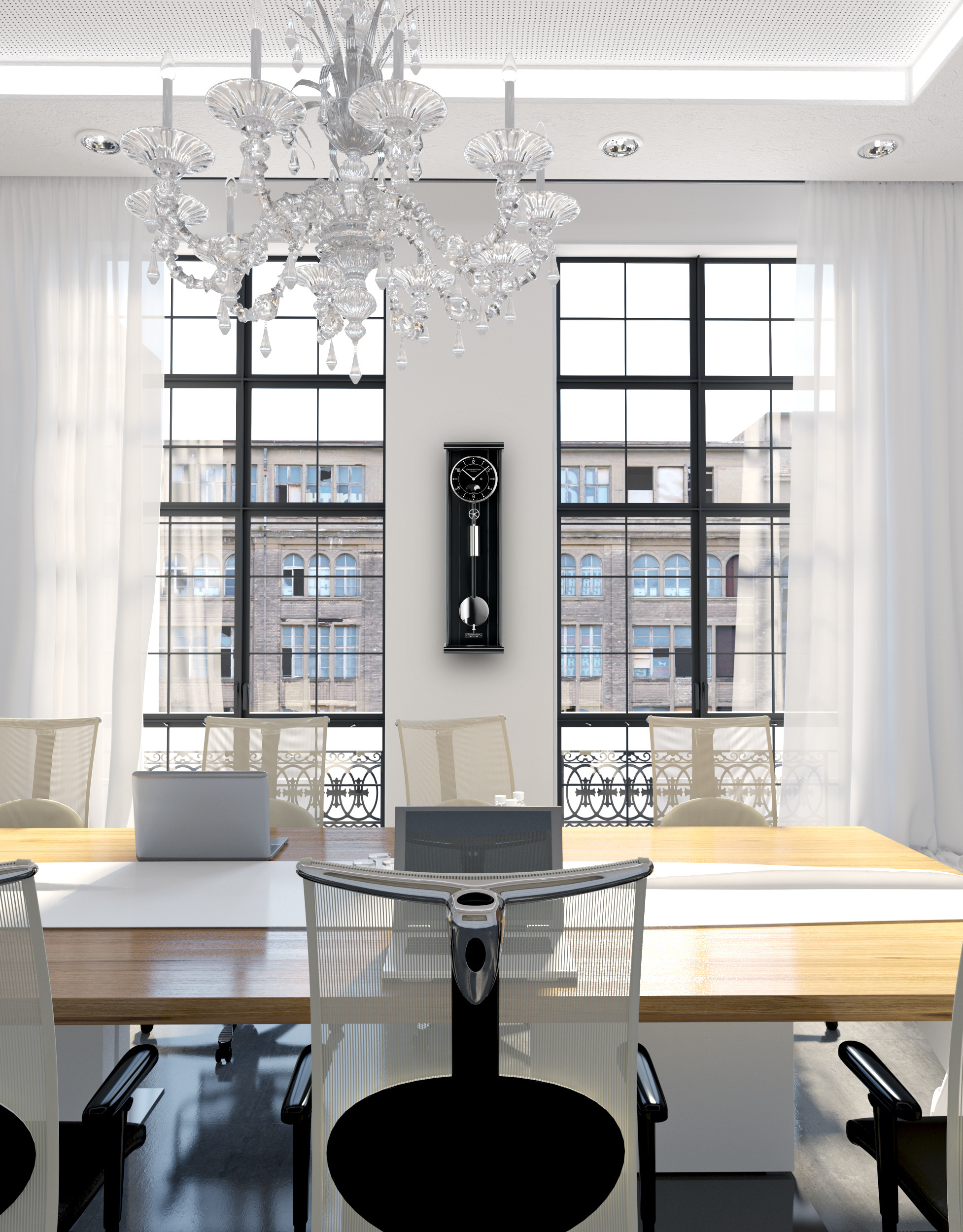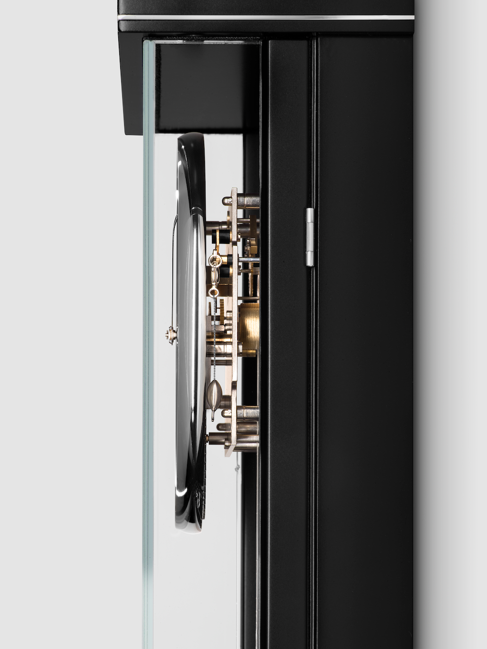 Die Zeitanzeige der Stunden und Minuten mit polierten Stahlzeigern wird bei diesem noblen Zeitmesser vervollständigt durch einen angenehmen Ton, den so genannten Passageschlag. Zu jeder vollen Stunde lässt ein kleiner Hammer eine Tonfeder kurz erklingen. Die kontinuierlich verstreichende Zeit unterteilt ein hochwertiges Holzstabpendel mit massiver Messinglinse in wohl definierte Abschnitte – in exakt 5184 Halbschwingungen pro Stunde. Die Feinregulierung ermöglicht eine griffige Rändelmutter unterhalb der polierten und vernickelten Pendellinse.
