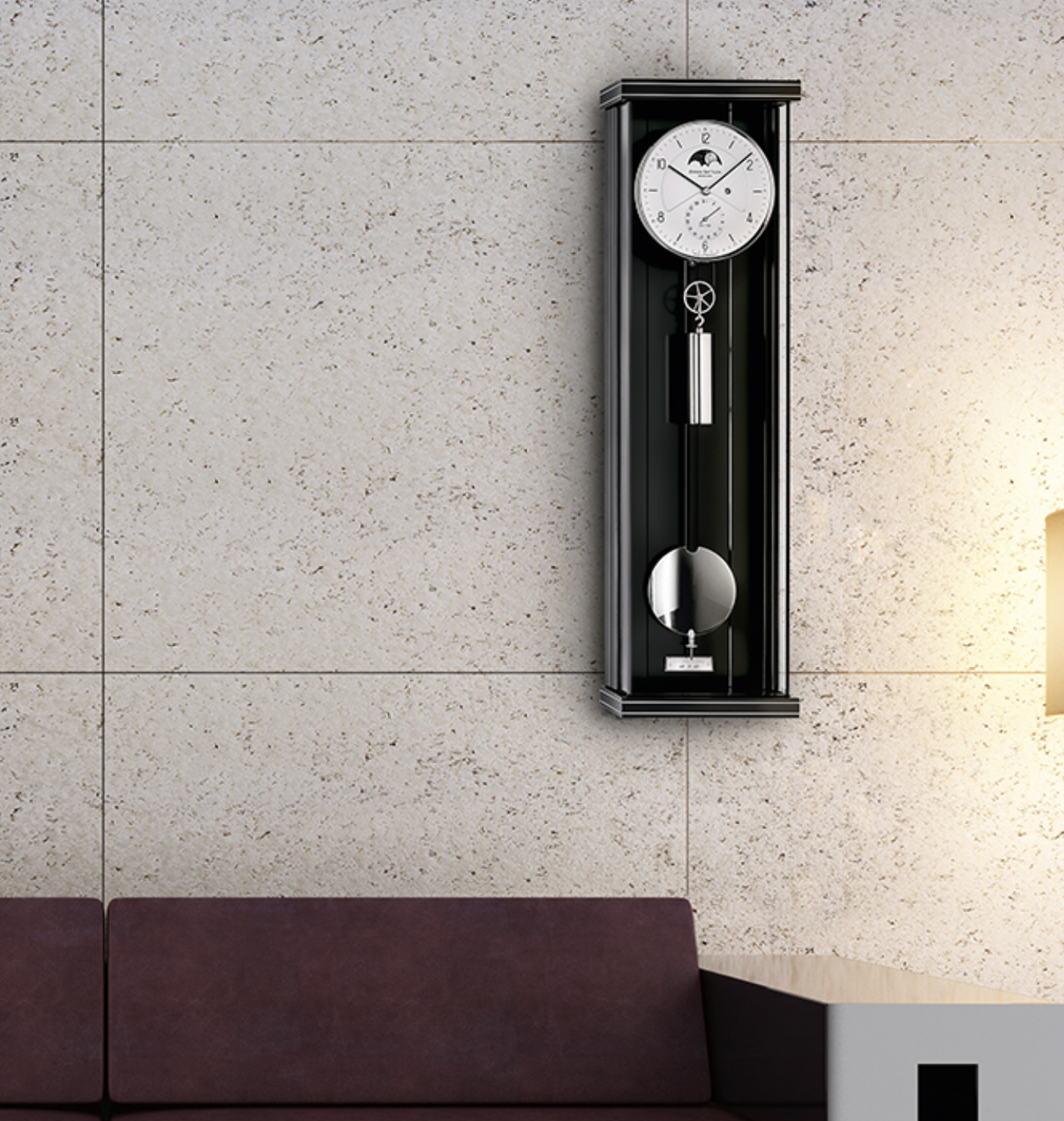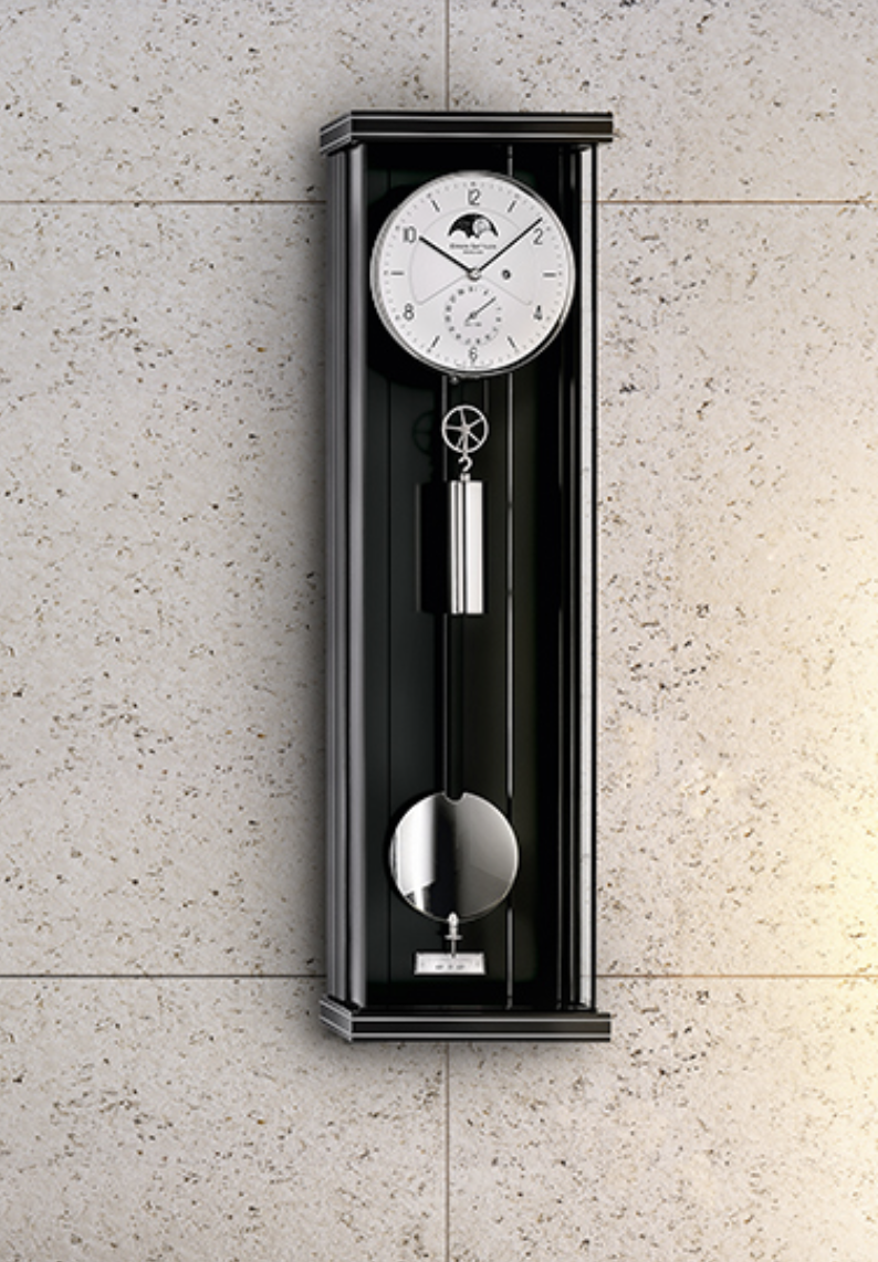 Die Zeitanzeige wird vervollständigt von einem angenehmen Ton. Die verstreichende Zeit unterteilt ein hochwertiges Holzstabpendel mit massiver Messinglinse – in exakt 5.184 Halbschwingungen pro Stunde. Das schöne zweiteilige Zifferblatt ist aus Aluminium gefertigt.