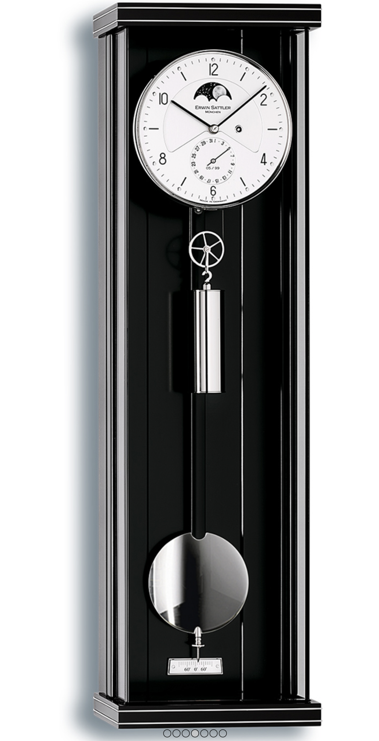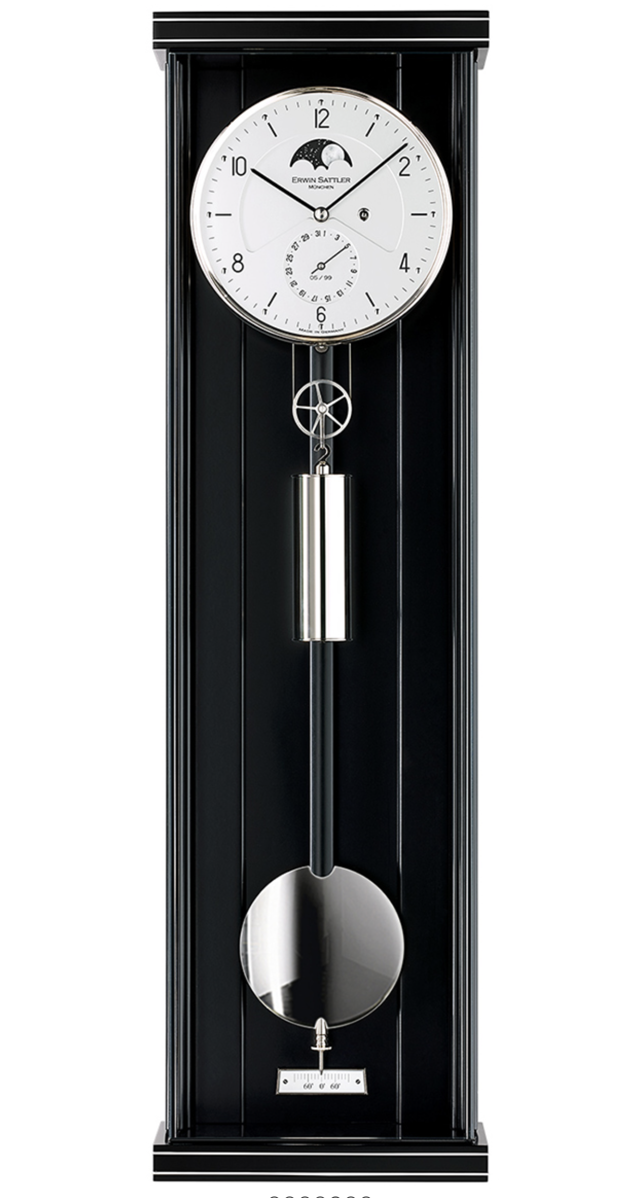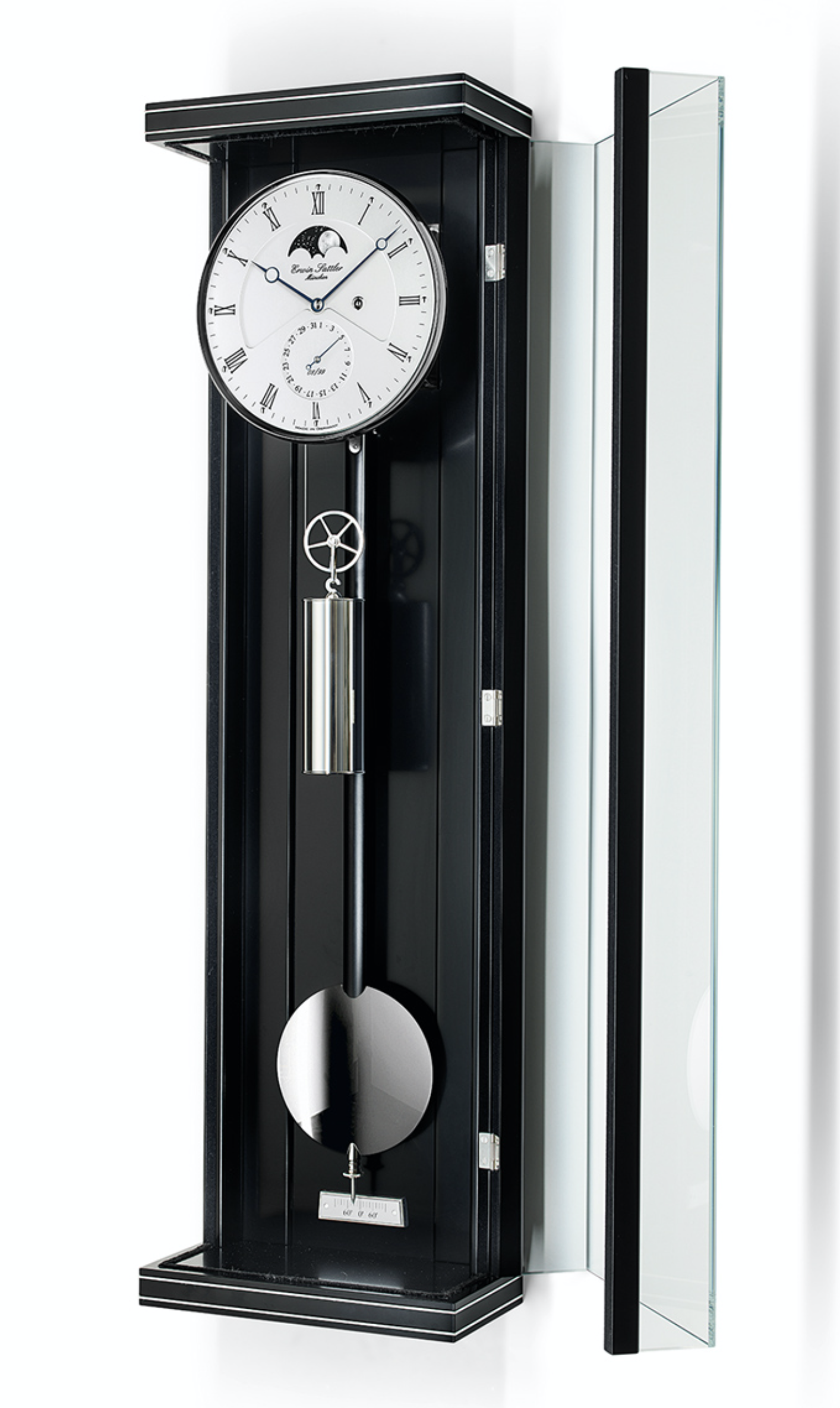 Diese feine Pendeluhr von Erwin Sattler misst lediglich 70 Zentimeter in der Höhe und findet fast überall einen würdigen Platz. Die schwarze Farbe des Holzgehäuses entsteht durch aufwendigen Schleiflack. Als dekorative Elemente verstehen sich hochwertige Metallintarsien. Völlig ungehinderte Blicke auf Zifferblatt, Zeiger, Uhrwerk und Pendel der Wanduhr Opus PMD 70 erlaubt das entspiegelte rahmenlose Mineralglas.