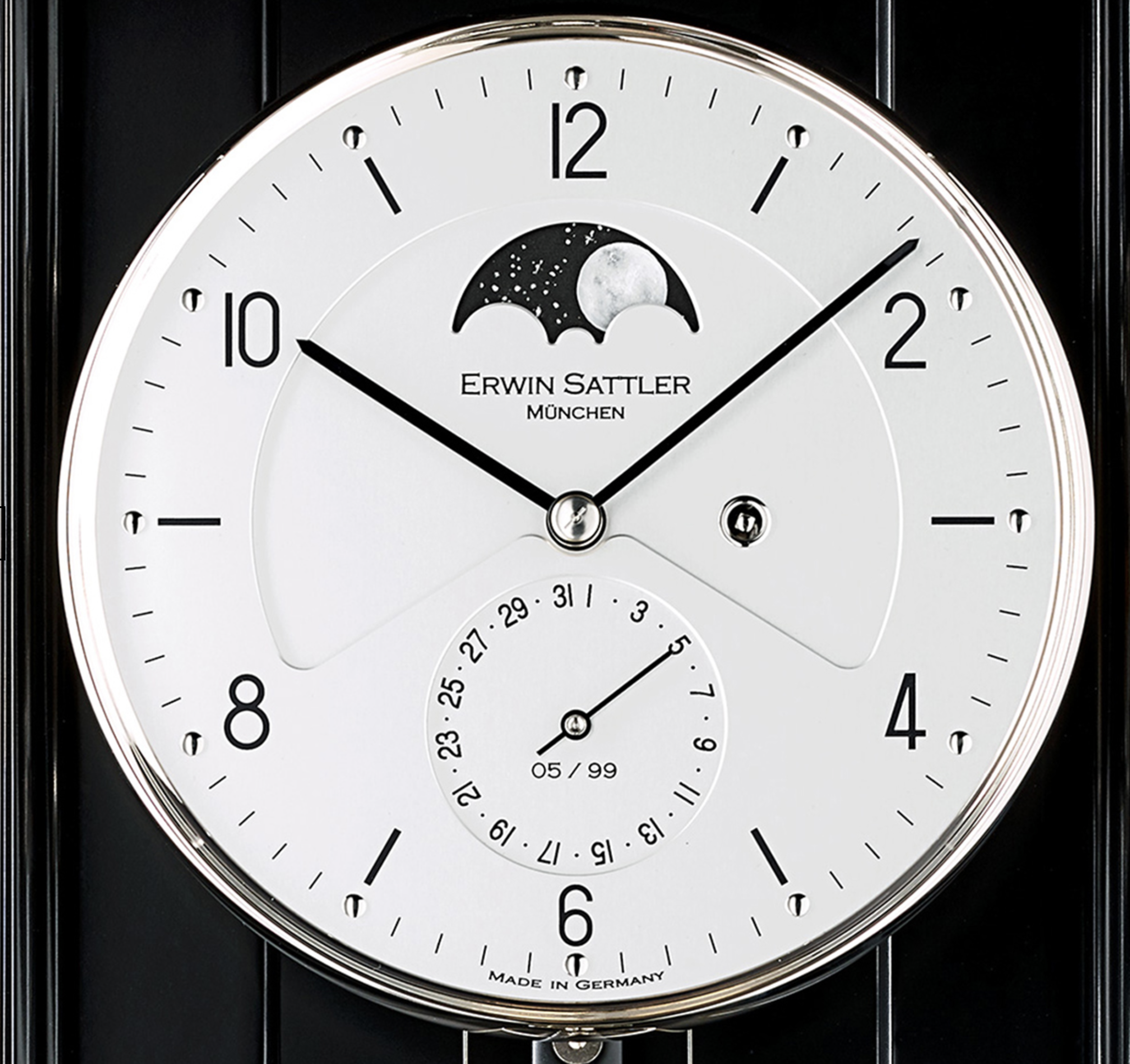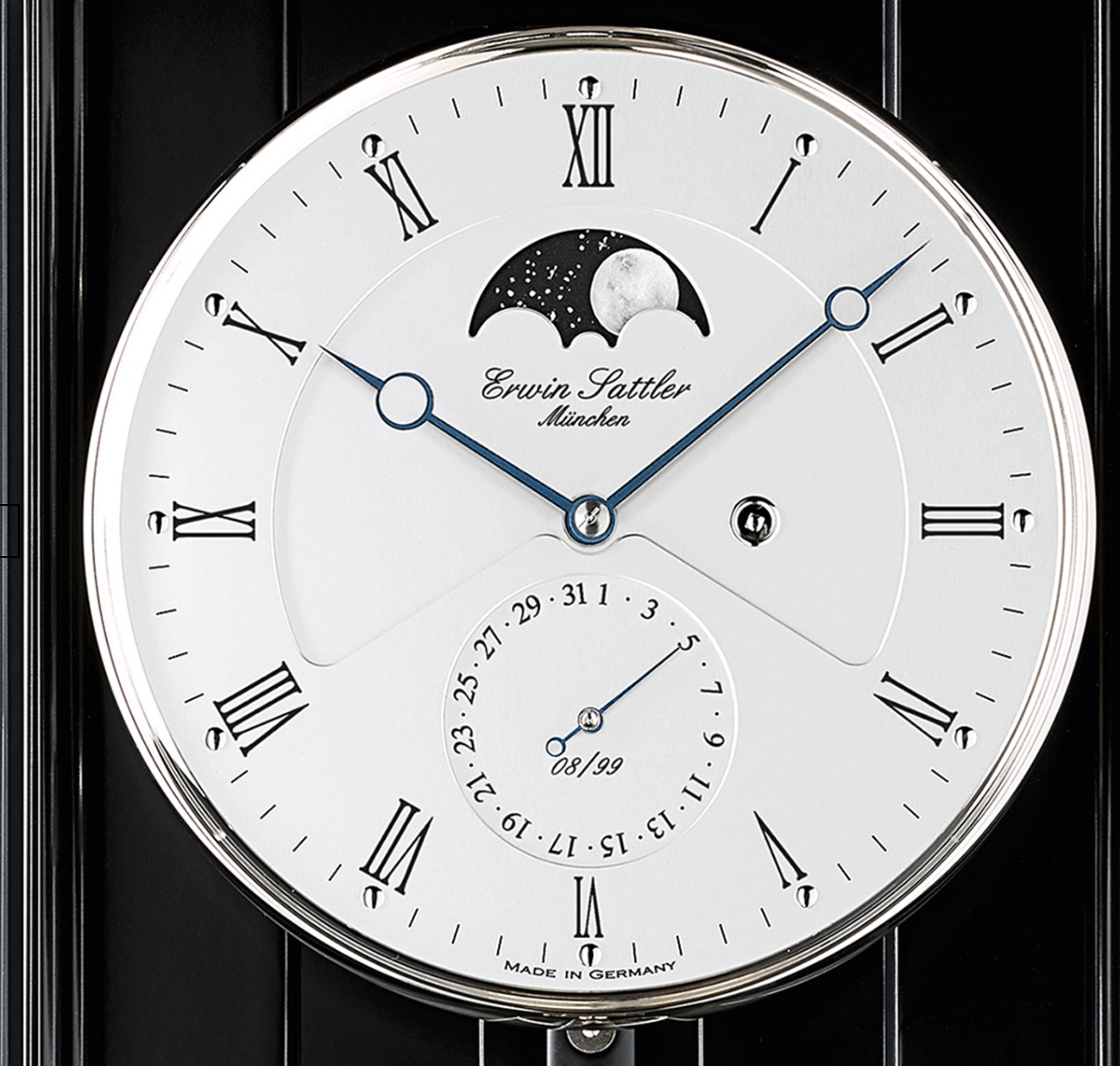 Zifferblatt: Aluminium, eloxiert, zweiteilig, durchnummeriert, handbemalte Mondscheibe, römisch oder arabisch, 12 aufgesetzte und polierte Indexe, Datumsanzeige