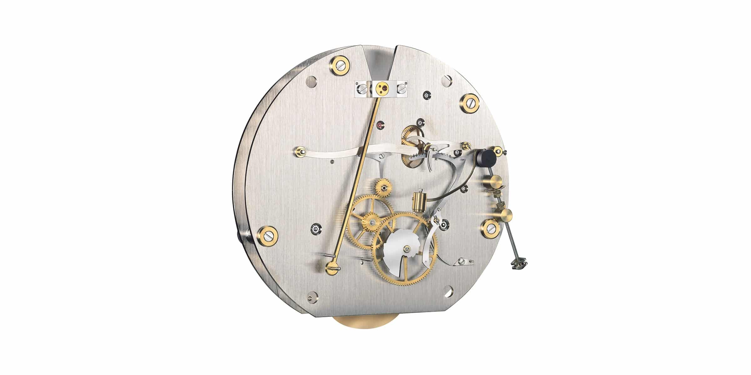Uhrwerk: Sattler Kaliber 2015, Durchbruch in der Vorderplatine, dreischenklige Gangradbrücke von Hand poliert, von vorne sichtbare Hemmung (Graham)