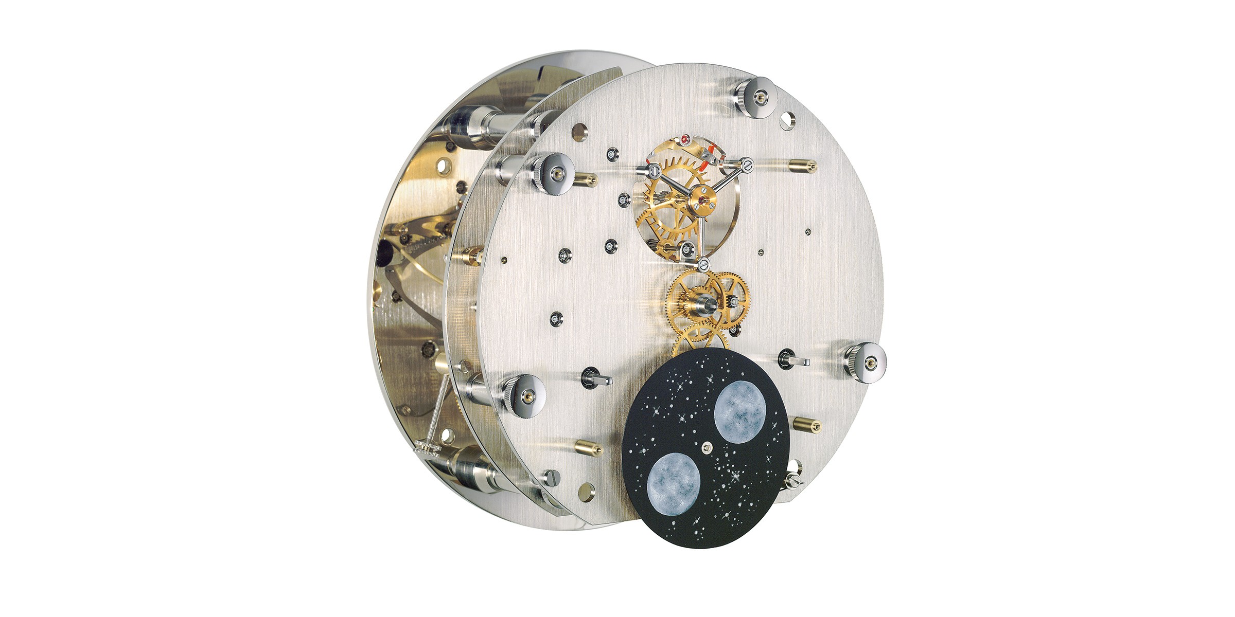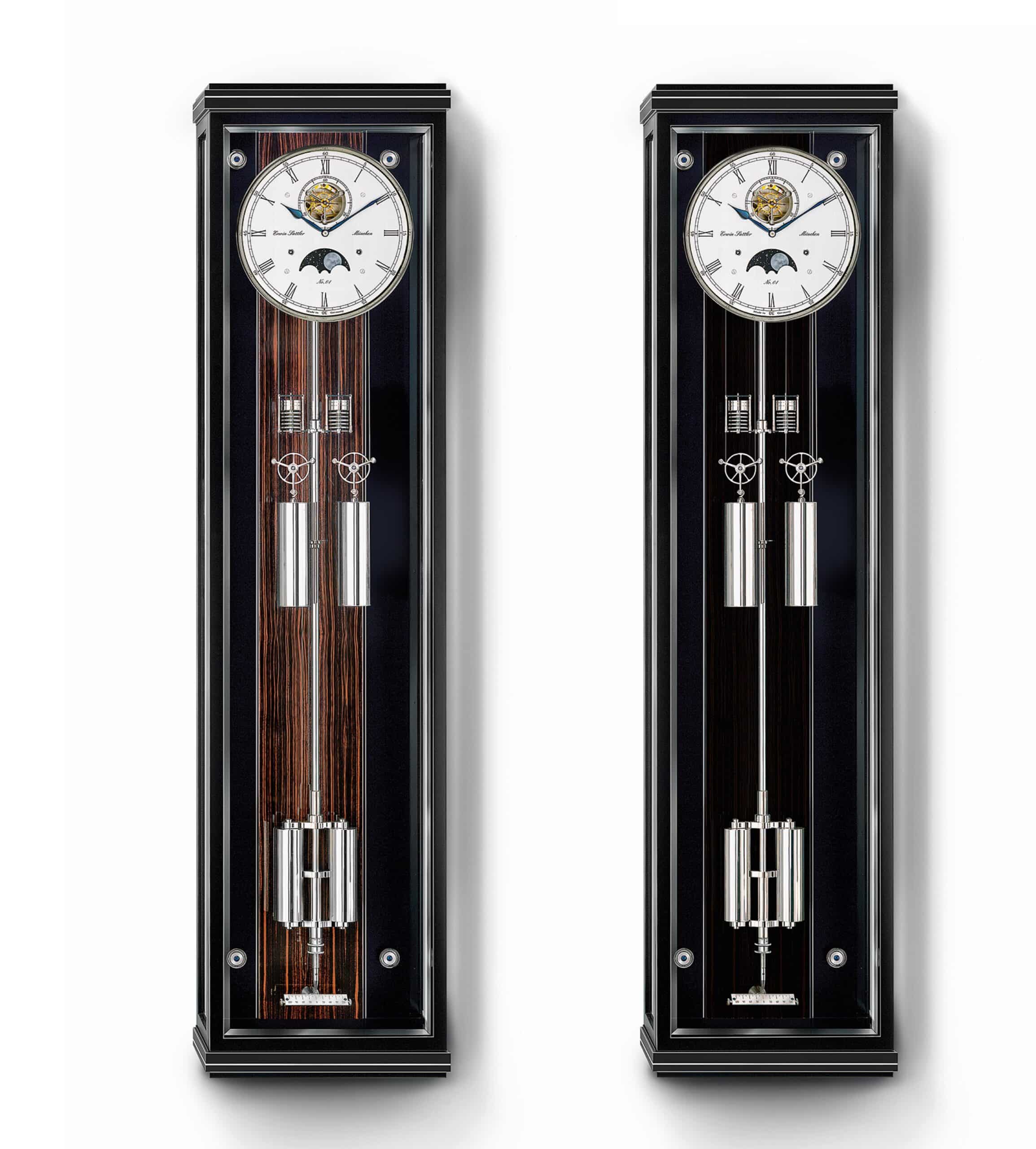 Der stolze Besitzer eines solchen, in Handarbeit gefertigten Zeitmessers wird sich nicht nur am beruhigenden Ticken des Uhrwerks, sondern auch am warmen Klang der Tonfeder zu jeder halben und vollen Stunde erfreuen können. Neben ihrem angenehmen Ton bietet die Uhr auch eine handgemalte Mondphasenanzeige, die dem versilberten Zifferblatt eine spezielle Ästhetik verleiht. In der Kombination dieser beiden Funktionen werden die optische Schönheit und die akustische miteinander vereint. Wie bei Präzisionspendeluhren aus dem Hause Erwin Sattler üblich, ist das Pendel der Wanduhr Secunda Sonata mit Temperatur und Luftdruckkompensation ausgestattet. Das vergoldete Räderwerk mit Monatsgangdauer ist komplett kugel- und rubingelagert, die klassische Graham-Hemmung wird durch Achatpaletten optimiert. Dieses exklusive Ensemble präsentiert sich in einem edlen, modern gestalteten Gehäuse, das durch Metallintarsien und eine Makassar-Kassette in der Rückwand vollendet wird.