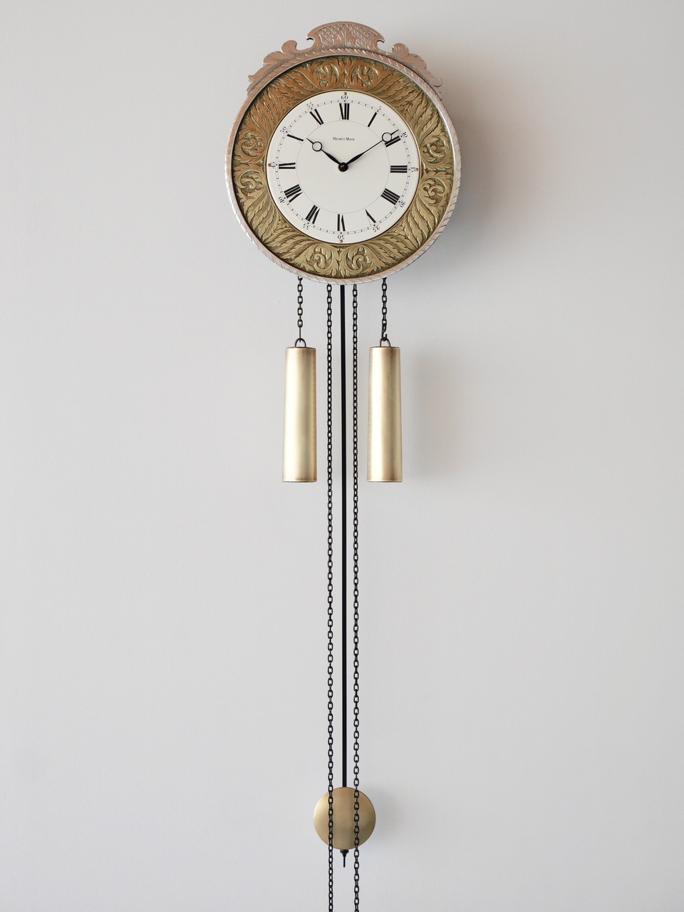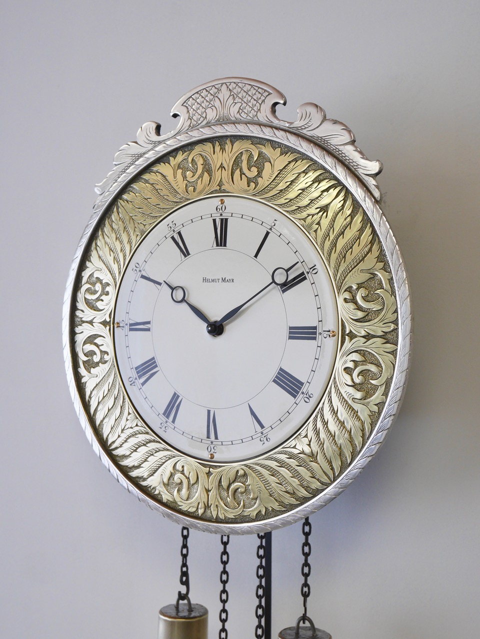 Die Schilderuhr von Helmut Mayr ist mit einem äußerst zuverlässigen und präzisen mechanischen Kettenzugwerk ausgestattet. Der dezente aber doch volle 1/2-h Schlag auf eine Tonfeder (schlägt zur halben Stunde einmal und zur vollen Stunde die Stundenzahl) ist selbstverständlich abstellbar.