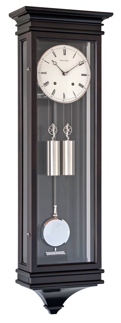 Wie alle HELMUT MAYR-Regulatoren besitzt auch diese Wanduhr handgefertigte Gewichte mit massiv gedrehten Deckeln und Böden und ein durchgehendes Kohlefaserstabpendel mit massiver, diamantgefräster Pendelscheibe.