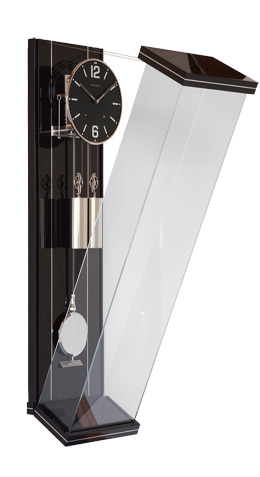 Der Regulator R1810 von Helmut Mayr zeichnet neben dem aufwändigen mechanischen Seilzugwerk ein Gehäuse mit besonderem Öffnungsmechanismus aus, welches die Mechanik durch die großzügige Verglasung besonders gut sichtbar macht.
