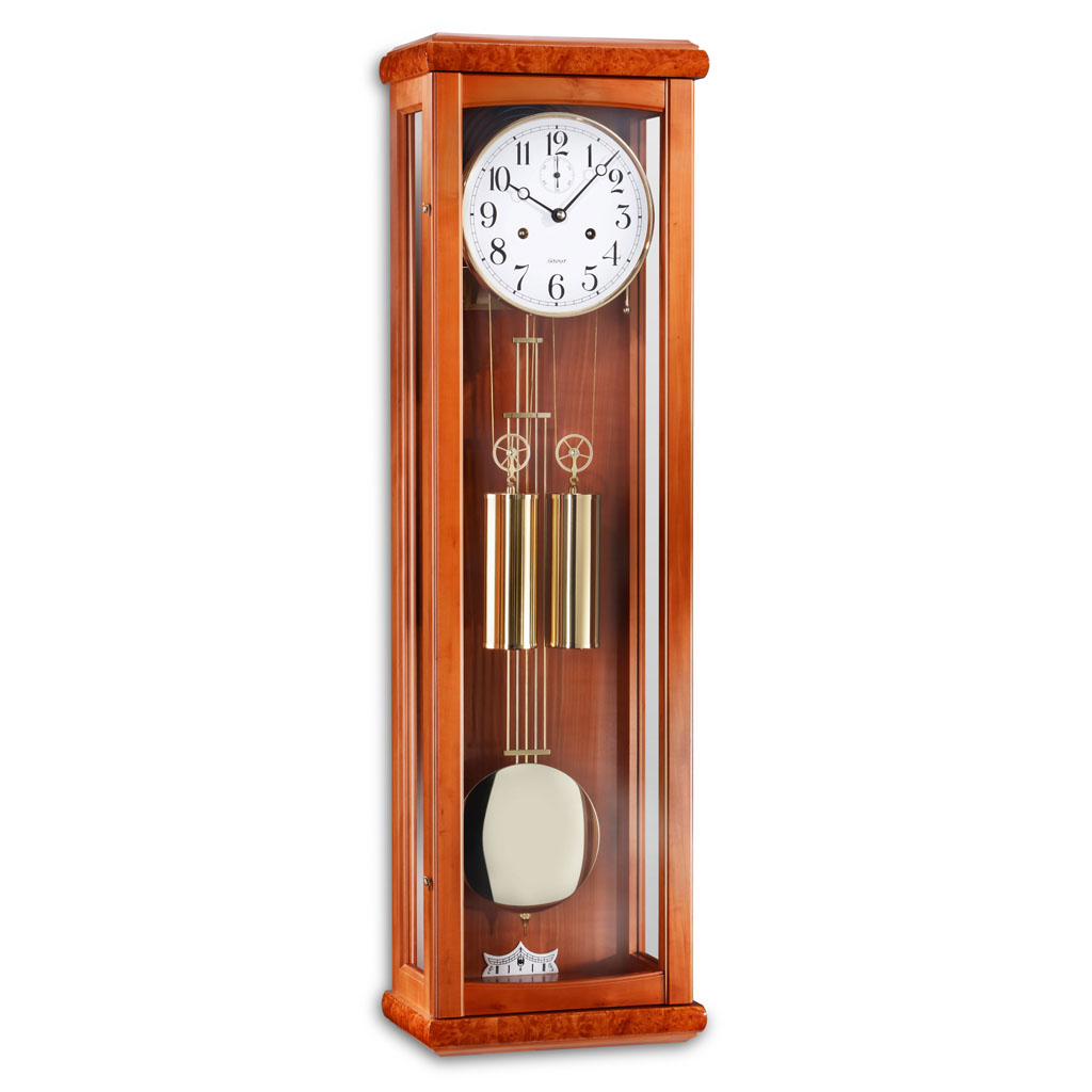 Die elegante, feine Wanduhr 2174-37-02 von Kieninger in Birnbaum besticht durch ihre handpolierten Wurzelfurnierteile, Türen und das echte Emaille-Zifferblatt mit 18 cm Durchmesser, welches über arabische Zahlen, eine Sekundenanzeige sowie handgefräste Breguet-Zeiger verfügt. Abgerundet wird das Modell durch ein poliertes Gitterpendel.