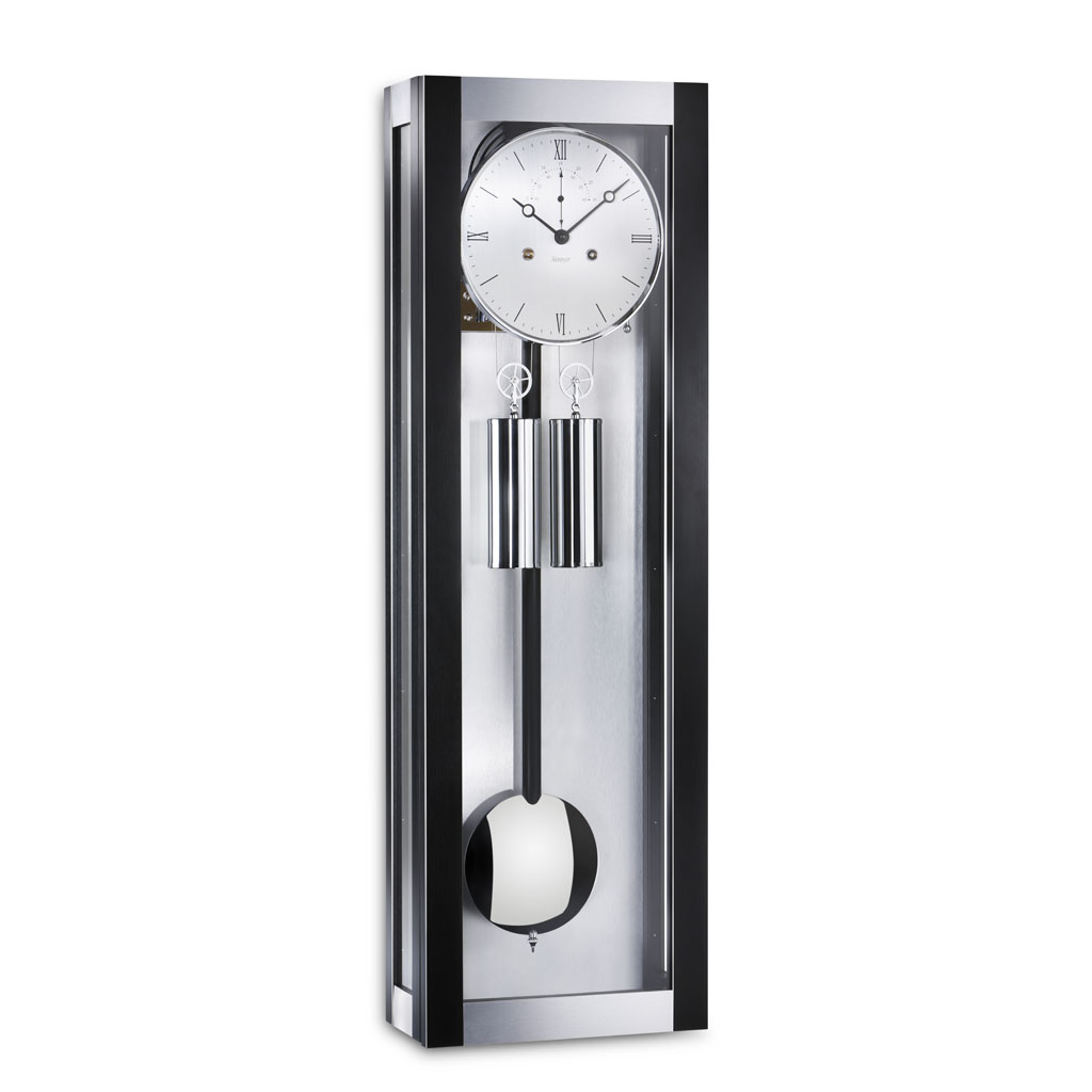 Der Regulator 2175-96-01 von Kieninger besticht durch sein technisches Design und richtet sich an Puristen. Das Gehäuse ist schwarz gebeizt, mit Seitenverglasung, massiven Aluminium-Friesen und einer Rückwand aus gebürstetem Aluminiumlaminat versehen. Das silberfarbene Zifferblatt mit einer Größe von 20 cm verfügt über eine große Sekundenanzeige, gefräste Breguet-Zeiger sowie eine verchromte Garnitur.