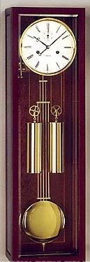 Die Wanduhr 2518-31-01 von Kieninger verbindet modernes Design mit einem klassischen Seilzugwerk. Das Gehäuse ist aus Mahagoni gefertigt, die Kristallgläser sind facettiert. Das Zifferblatt ist emailliert, hat einen Durchmesser von 18 cm und mit Sekundenanzeige. Die Breguet-Zeiger sind gefräst und das Kompensationspendel ist ebenfalls Teil der Ausstattung. Alle sichtbaren Garniturteile sind aus Messing gefertigt.