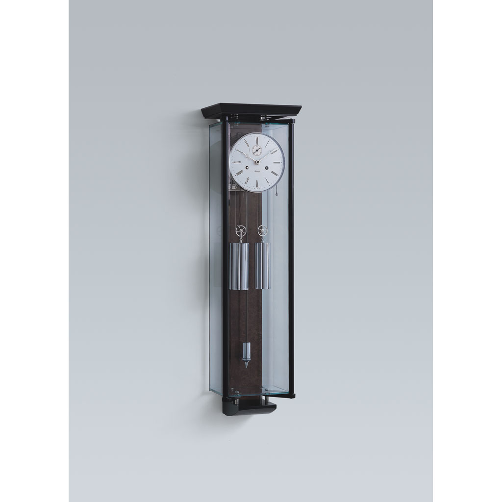 Die Wanduhr 2548-96-01 von Kieninger überzeugt durch ihr innovatives Gehäuse mit großzügiger Verglasung in feinem schwarzem Schleiflack. Die Rückwand ist aus hochwertigem Nussbaum-Wurzelfurnier gefertigt. Das Pendel besteht aus Karbonfaser. Der Monatsläufer verfügt über ein weißes, geschlossenes Emaillezifferblatt mit einer Größe von 18 cm.
