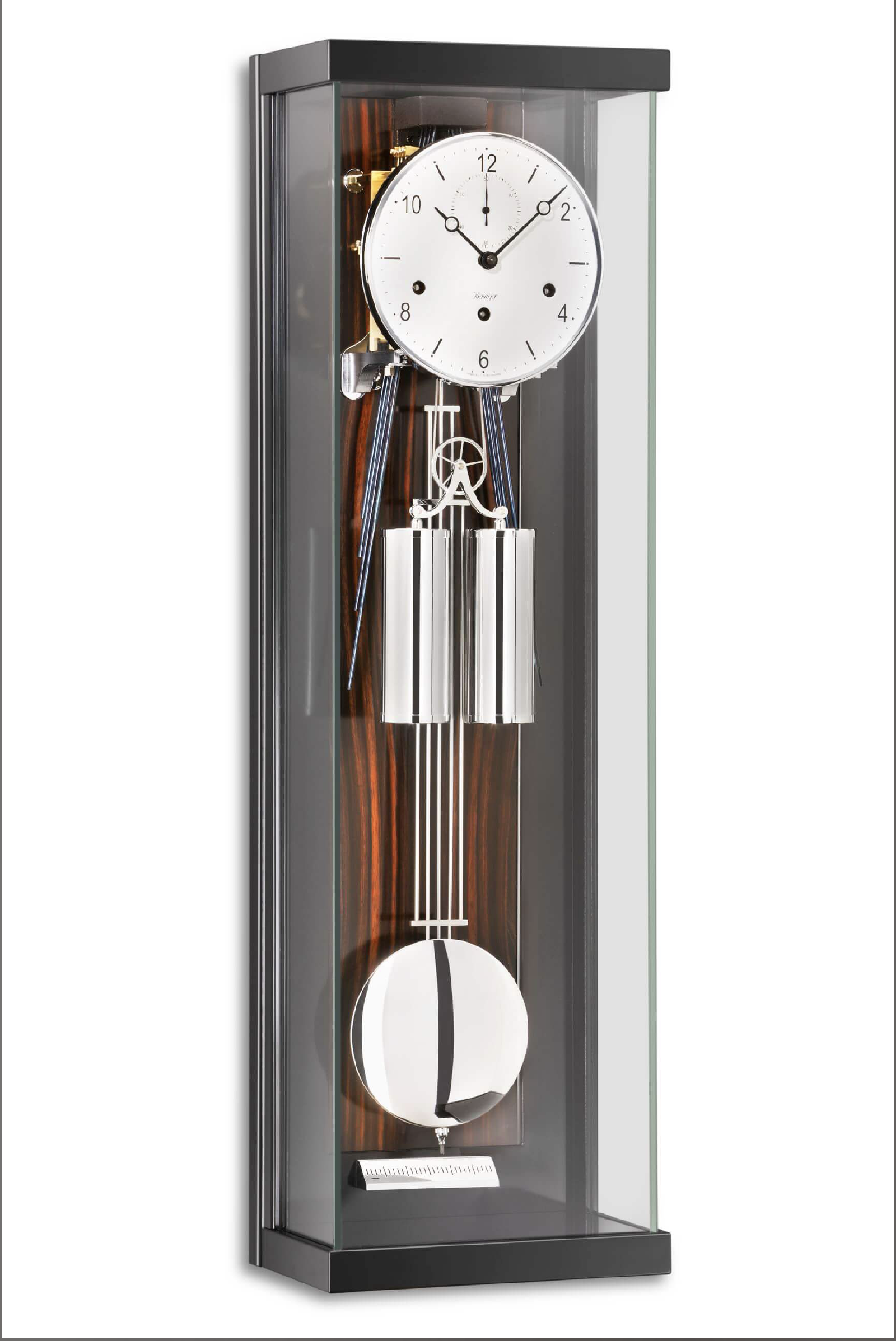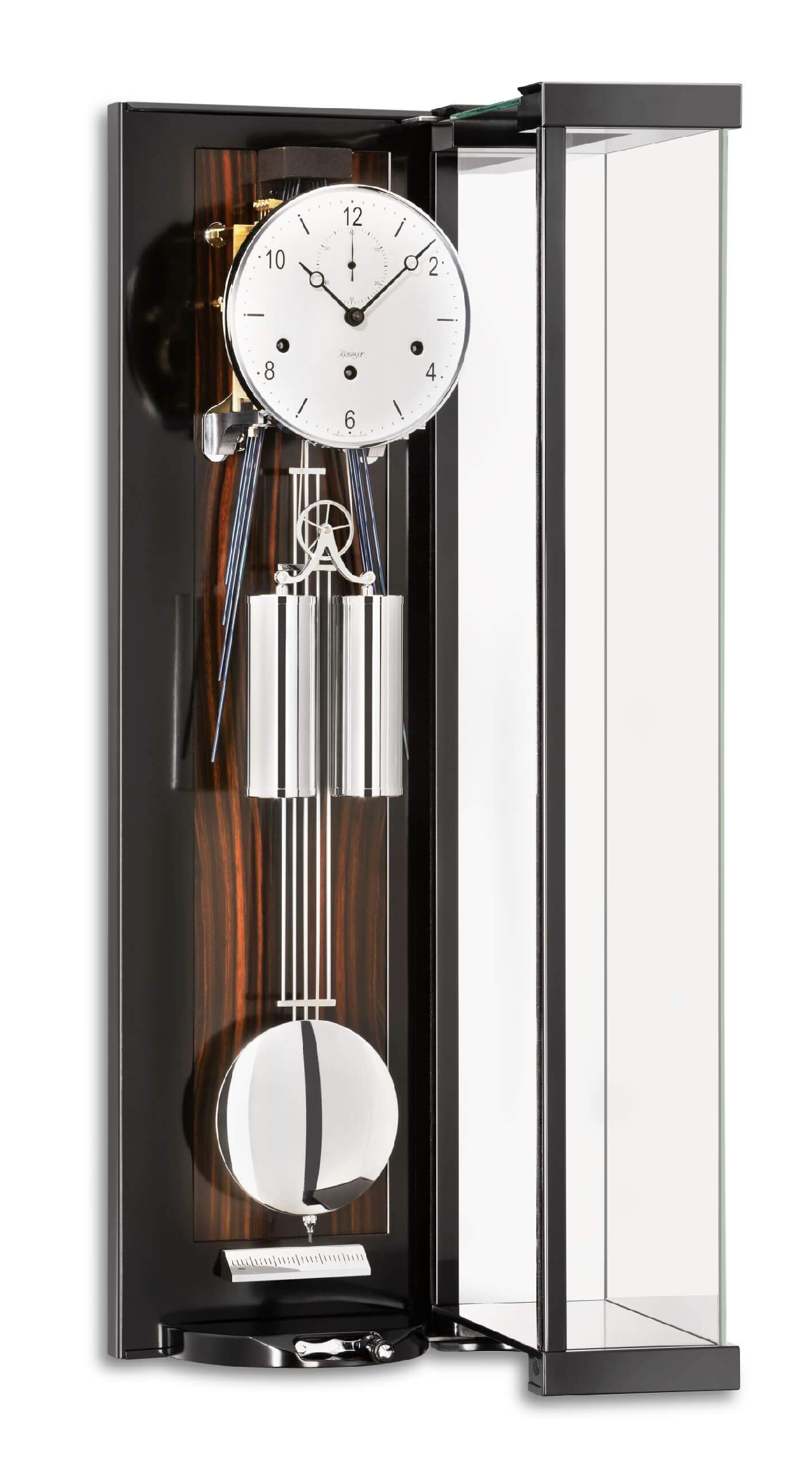 Die Wanduhr 2551-57-01 von Kieninger präsentiert sich als eleganter Seilzugregulator mit Gehäuse in schwarzem Schleiflack, einer Rückwand aus Nussbaum und einer UV-verklebten Glastür. Das echt emaillierte Zifferblatt verfügt über Breguet-Zeiger und eine Sekundenanzeige sowie eine Pendelskala. Alle sichtbaren Garniturteile sind verchromt.