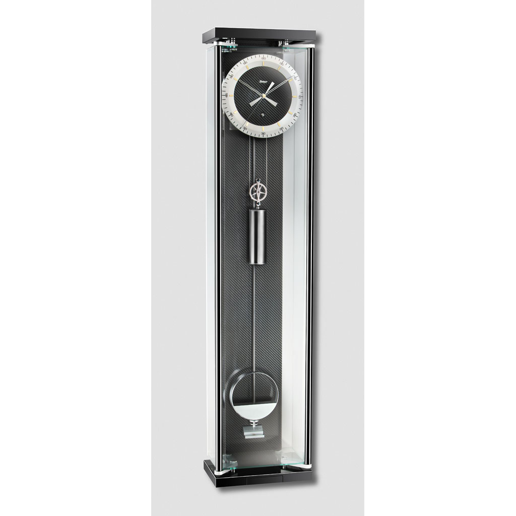 Das Gehäuse besteht aus einem von 4 Metallträgern gehaltenen UV-verklebten Glaskorpus mit Karbonfaser in Rückwand und Zifferblatt und einer im Sockel integrierten Schlüsselschublade. Eine optimale Positionierung wird durch 4 verdeckte Wandstellschrauben erreicht. Matt verchromte bzw. eloxierte Metallteile und ein Zifferblatt mit Appliquen aus poliertem Messing runden das edle, technische Design der Uhr ab. Präzisions-Karbonpendel mit Temperaturausgleich und Feinregulierung