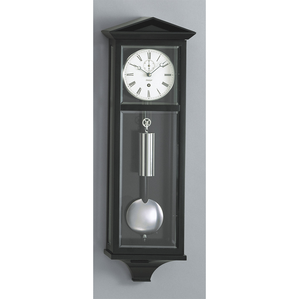 Der “Wiener Dachl”-Miniatur-Seilzugregulator 2800-96-02 aus dem Hause Kieninger besticht durch sein Gehäuse aus feinster schwarzer Schleiflackoberfläche sowie vier facettierter Kristallgläser. Das Zifferblatt ist aus Emaille gefertigt und hat einen Durchmesser von 11,5 cm. Die Wanduhr verfügt über eine Sekundenanzeige sowie einen Chromreif und gebläute Breguet-Stahlzeiger. Das Pendel besteht aus Holz und ist mit einer verchromten Pendelscheibe von 8 cm Durchmesser ausgestattet. Das Gewicht ist aus verchromtem Messing gefertigt.