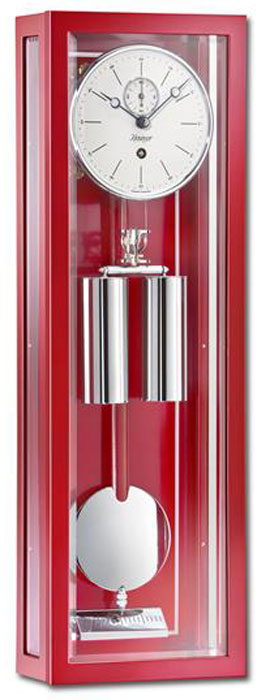 Wir präsentieren Ihnen den minimalistischen Miniatur-Seilzugregler 2806-77-02 “Micronis” von Kieninger. Das Gehäuse ist aus rotem Schleiflack mit Metallintarsie gefertigt, facettierte Kristallgläser, das Zifferblatt hat einen Durchmesser von 11,5 cm und verfügt über eine Sekundenanzeige. Ein diamantgedrehter Zierring, poliertes Messingreif und gebläute Breguet-Stahlzeiger runden das Design ab. Der passend lackierte Holzpendel mit polierter Messingscheibe hat einen Durchmesser von 8 cm. Verchromte Messinggewichte rundet die hochwertige Wanduhr 2806-77-02 “Micronis” ab.