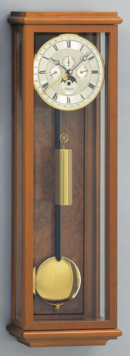 Wir präsentieren Ihnen den klassisch eleganten Seilzugregulator 2851-41-02 von Kieninger in extrem flacher Bauweise. Das Gehäuse dieser Wanduhr besteht aus Kirschbaumholz und ist mit facettierten Kristallgläsern versehen. Das versilberte Kalendariumszifferblatt verfügt über Rauten. Das Modell verfügt über ein Ätzdekor, diamantgedrehte Zahlenreifen, eine Mondphasen-, Sekunden-, Datums-, Wochentags- und Monatsanzeige sowie eine einfache Einstellung der einzelnen Funktionen. Handgefräste, gebläute Breguet-Zeiger und eine Garnitur in verchromtem Messing runden das Design ab.
